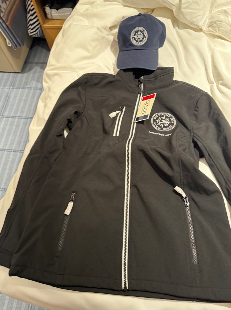 Santa arrived in our Cabin last night while we were at dinner and left two Viking 2023/2024 World Cruise Jackets. There were also two Viking beach/tote bags that contained a 2023/2024 world cruise cap, a leather wallet to carry our key cards, and a 2023/2024 World Cruise Lapel pin.