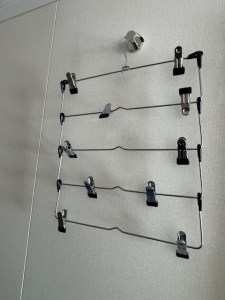 If you’ve been following our list of “Pro-Hacks and Lessons Learned” you’ll see that we recommend using ladder hangers. We have two types of ladder hangers that we use. The first are like the one shown here with clamps. This type is great for shorts and skirts. The other type is with straight horizontal pieces without clamps used to hang trousers. Using these types of hangers allows us to store four items in the same place that a single hanger would normally take.