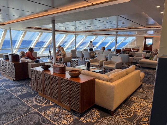 This is the upper level of the two deck explorers lounge located at the very front of the ship. The room has floor to ceiling windows offering an incredible view of the open ocean. This is an amazing place to watch for ocean wild life and to enjoy scenic cruising; this is where we spent most of the day when we transited the Panama Canal.