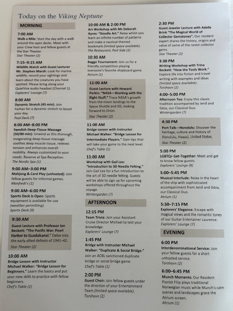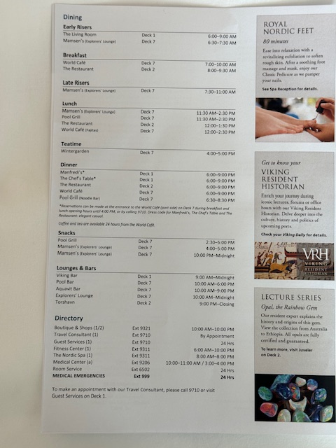 On most days there will be three or four lectures or presentations offered ranging from the history of pacific explorers to whale migration/watching to World War II battles in the Pacific. Every day we receive the Viking Daily which provides the schedule for the day. The Daily is four pages long. The front page shows the weather forecast, if in port the dock location and ship contact info as well as a brief description about the port of call. Page two and three shows the daily schedule of events, if it’s a port day page three will list information about departure times and gathering places for the various excursions. Page four shows the hours of operation for the restaurants, spa and shops. Here’s an example: