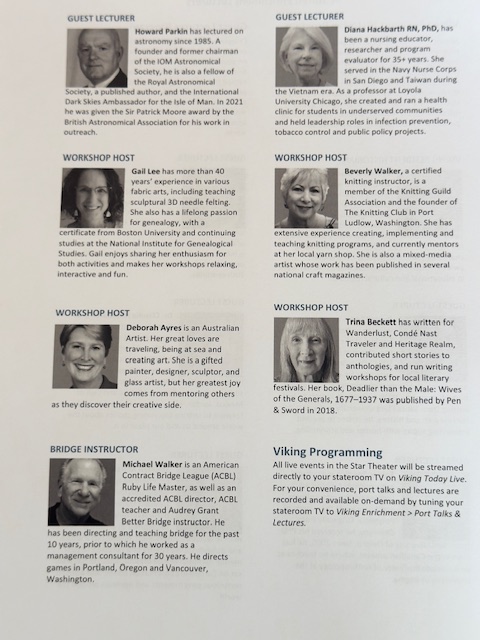 The daily activities that make Viking special is the enrichment program that consists of an onboard resident historian, guest lecturers and various workshop hosts. The guest lecturers focus on topics relative to the Voyage itinerary. So, the speakers on board at the moment are focusing on the history and culture of the Pacific. Here in a list of the speakers and workshop hosts currently on board.