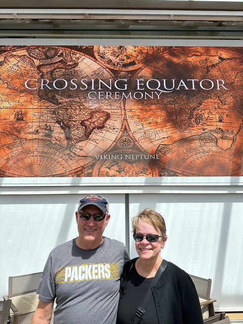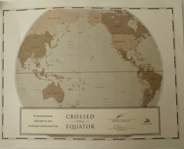 Today we crossed the Equator and moved into the southern hemisphere. It is tradition for mariners to conduct a line-crossing ceremony as an initiation rite for a person’s first crossing of the Equator. In the 18th century and earlier, the line-crossing event could be quite brutal involving hazing of the “pollywogs” (sailors who were crossing for the first time) involving beatings with boards, wet ropes and even throwing the “pollywogs” overboard.