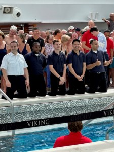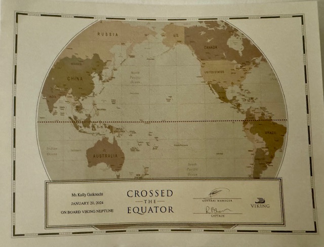 On Viking Neptune the tradition is to kiss or salute a tray of fish, dive into the pool for an equatorial baptism followed by a shot of Aquavit (A spicy Scandinavian distilled spirit). Upon completion of the crossing ceremony sailors achieve the official status of “Order of the Shellback”. First, all crew members who are crossing the Equator for the first time are initiated into the Order of Shellback followed by the passengers who are crossing for the first time by ship.