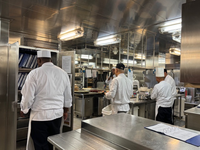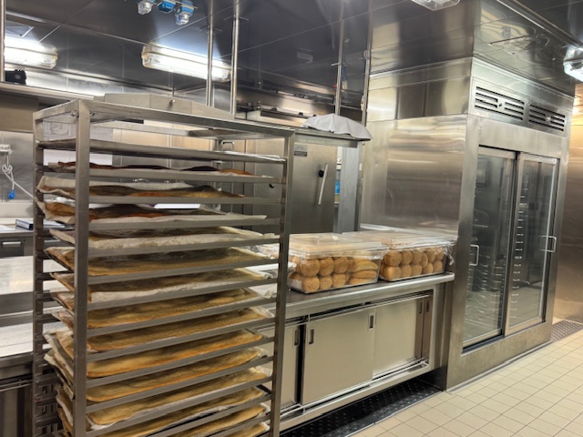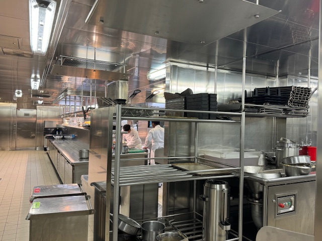 The tour began with a walk through of the Neptune’s main galley (kitchen). All Viking cruise ships are subject to US health standards and are subject to unannounced health inspections in any US port of call. Apparently, US health standards for ships are the most stringent in the world so that is the standard that Viking follows. The ship employees 101 Chefs and Cooks who prepare over 5000 meals per day primarily from this galley. Our first impression was the wonderful smells, but even more impressive was the cleanliness of the galley.