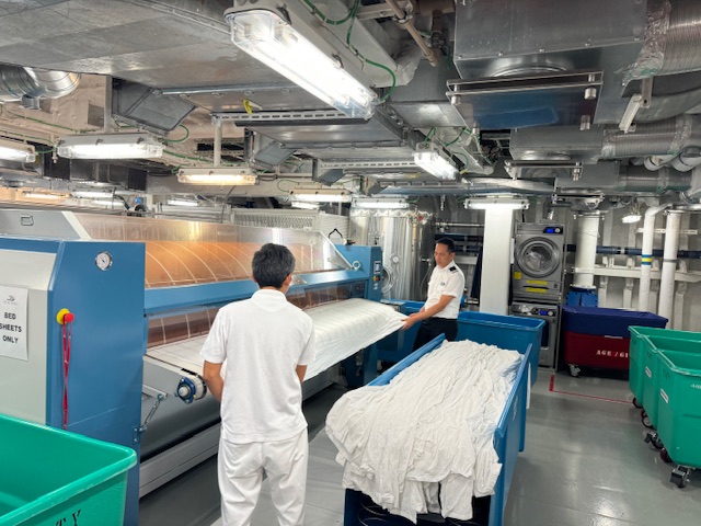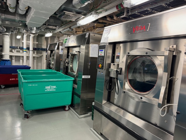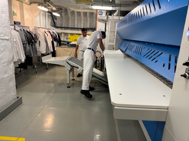 From here we moved down to Deck B, which is the first of two decks located below the water line. This is where the engine room and Kully’s favorite stop, the ship’s laundry is located. We weren’t able to visit the engine room, but we did get to see the Laundry Room. There are two sections in the laundry, one that deals with ship linens — towels, tablecloths and bedding and the other that deals with clothing – Crew uniforms, crew personal clothing and guest clothing. We were most impressed with the linen side of the operation. Here there were several large commercial washers and dryers plus a very large machine used to dry and fold sheets and tablecloths. Kully tried to find one on Amazon, but no luck.