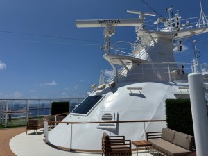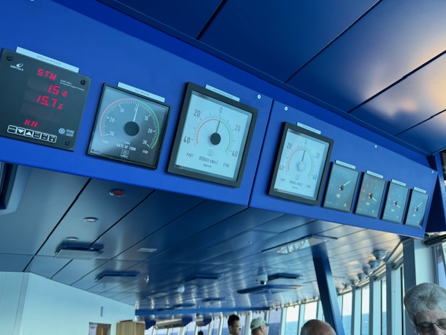 The Navigational Bridge tour was conducted by one of the Officers of the watch. Like the behind the scenes tour, this tour is conducted periodically throughout the voyage so that all interested guest get an opportunity to visit the bridge. This was the first time I’ve ever been on the bridge of an Ocean Liner, so I was really excited to see what the bridge looked like. The bridge is where the ship’s navigational crew “drives” the boat. Obviously, there is more to it than just steering and controlling the throttle. The ships course must be determined, set and maintained; obstacles avoided; harbors navigated; and docking operations/maneuvers executed. Most of the navigational operations are automated and carried out by two officers per watch. More are on the bridge during critical maneuvers and docking operations.