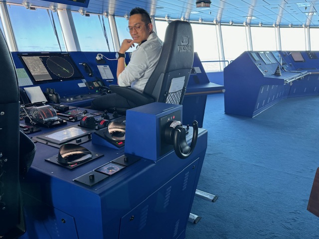 We had the opportunity to take a behind the scenes and navigational bridge tour of the Viking Neptune. The three top officers on the ship are the Master of the Vessel who commands the ship and is primarily responsible for all navigational aspects of the voyage; the Chief Engineer who is responsible for all mechanical aspects of the ship; and the Hotel General Manager who is responsible for everything else — food service, state rooms, housekeeping, bars, guest relations, laundry, ship supplies, and entertainment staff all are under his supervision; 401 of the 465-person crew are in this department. All of three of these gentlemen are very busy, yet they all make themselves available to answer guest questions and even conduct tours. We were pleasantly surprised to discover that Hotel General Manager Ronald Schweighardt personally leads the behind-the-scenes tour of this state-of-the-art, $400 million dollar vessel. He doesn’t do this just once per voyage, but several times each week ensuring that all guest who might be interested in the tour get an opportunity to take a tour.
