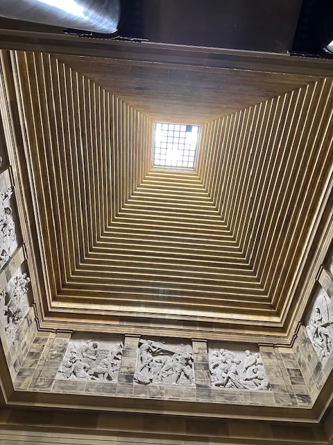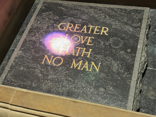 The Second level is the Sanctuary, a peaceful area of reflection where a ray of light coming down through the center of the roof illuminated the commemorative stone in the center of the room every half-hour as it does naturally at 11 AM on the 11th day of the 11th month – Remembrance Day (Veteran’s Day in the USA). The inscription on the stone is “Greater Love Hath No Man”.