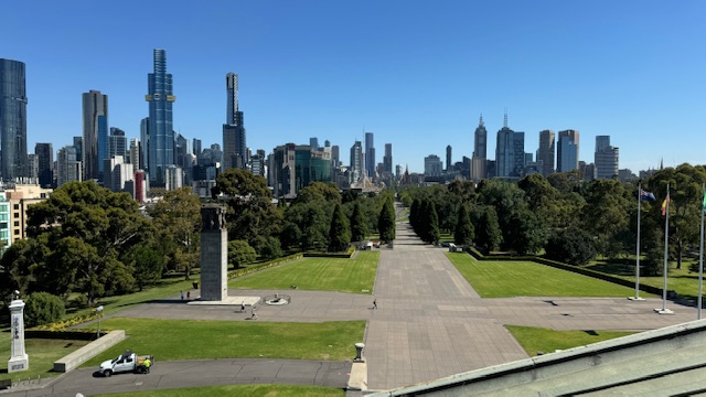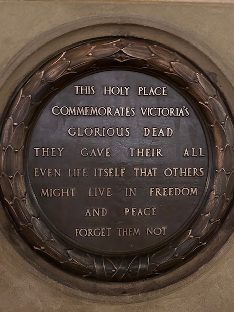 The bus continued through Albert Park on the park road which also serves as the Grand Prix Circuit for the Australian Grand Prix. Crews were already setting up grandstands and installing barricades for the race scheduled for late March. We arrived at the Melbourne Shrine of Remembrance originally built to honor WWI veterans, but now honors all of the nation’s veterans. The goal of the shrine is to share the stories of ordinary people in extraordinary time whose efforts and experiences helped build the nation of Australia.