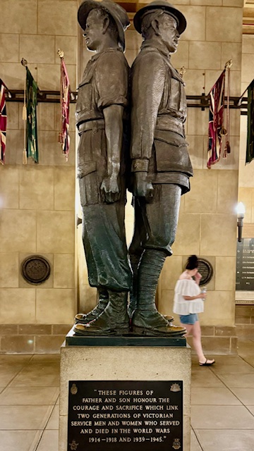 The shrine has three levels. In the center of the first level is the Crypt which commemorates the fighting units of WW I the center piece of the Crypt is a father – son statue where the father is the WW I veteran seeing his son go off to WW II twenty-one years later. The crypt is surrounded by Galleries that are comprehensive exhibits showing photo’s, artifacts and the personal effects of veterans throughout Australia’s history.