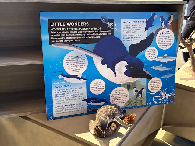 Lucky for us Summerland Beach has back-up generators, so we were able to go ashore this evening to watch the Penguin Parade. There are estimated to be 32,000 breeding pairs of the world’s smallest species of penguins living on Phillip Island. In 1920, a group of island residents introduced visitors to the penguins’ nightly procession, sparking conservation efforts to protect wildlife and invest in research and education initiatives.