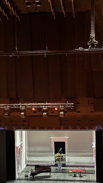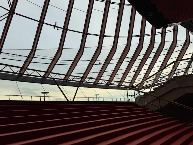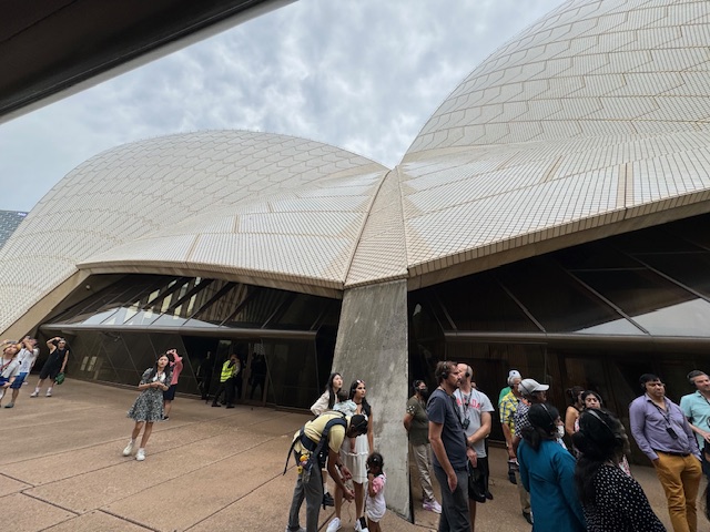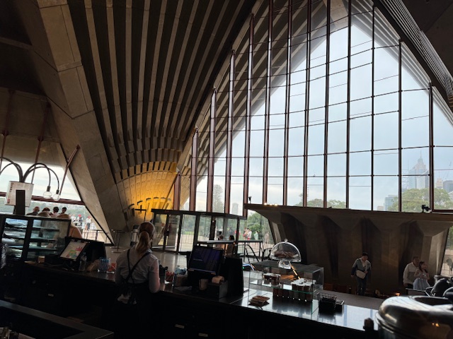 Surprise they’re not all white. There is a pattern of white and beige tiles, if they were all white the reflection would be too bright and would be hard to look at. The lobbies and corridors of the Opera House have a very ’70’s feel; very utilitarian, straight lines. I expected it to be more ornate. We were able to visit one small multi- purpose theater called the studio and the Joan Sutherland Theater where musicals and Operas are staged. We were unable to visit the larger Concert Hall, because there was a performance.
