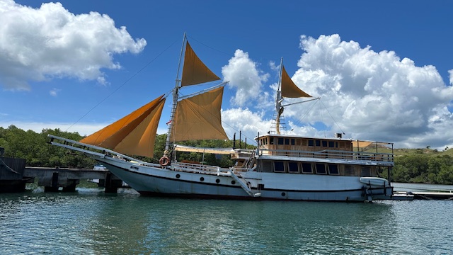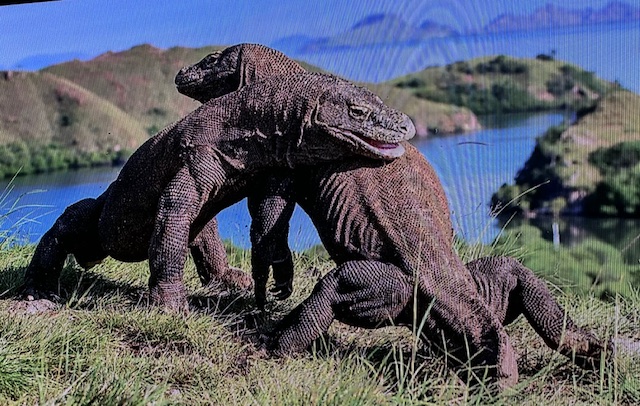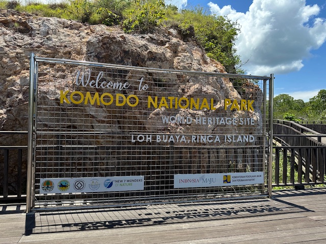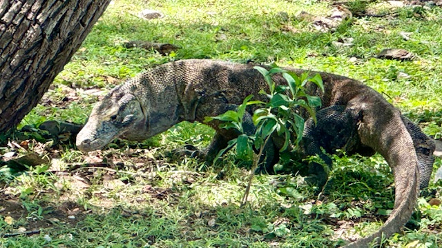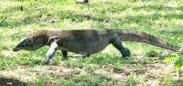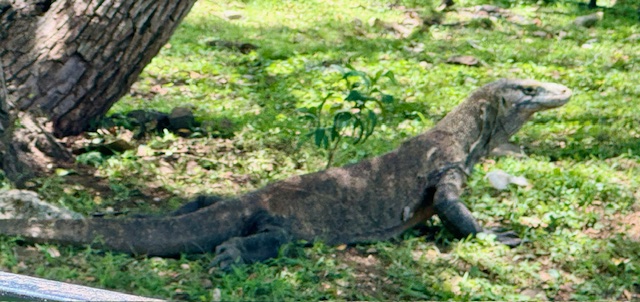 Today we stopped at the Komodo National Park, our first of three stops in Indonesia. Specifically, we were on the island of Rinca home to the Komodo National Park Museum and visitors center. The national park spans 670 square miles encompassing 26 small isles and the three larger islands of Padar, Komodo and Rinca. Rinca was a great place to see the world famous Komodo Dragon, the world’s largest lizard. The Komodo Dragons can grow up to ten feet long and typically weigh about 150 pounds. The Komodo’s feed on the native deer, wild pigs and water buffalo that inhabit Rinca. The Komodo Dragons rarely need to capture live prey directly, since their venomous bite delivers toxins that inhibit blood clotting causing the animal to go into shock and die. Additionally, their saliva contains a high level of bacteria that also cause infections contributing to the death of their prey. Full grown Komodo’s have been known to attack humans.