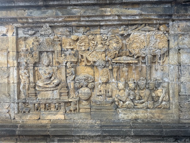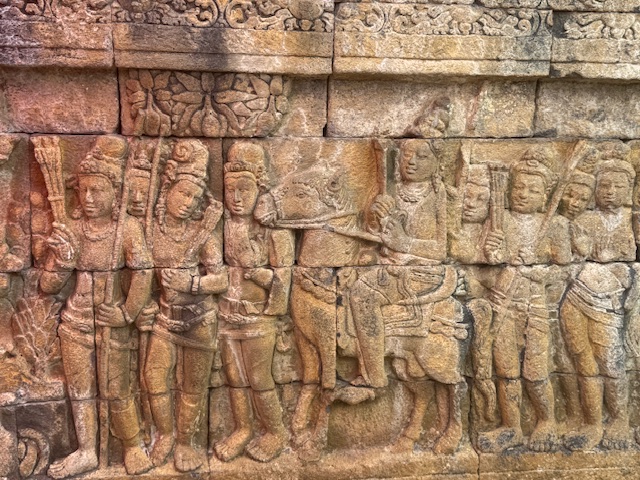The Borobudur Temple is constructed of gray stone and consists of nine stacked platforms, six square and three circular, topped by a central dome. The temple was built during the 8th and 9th centuries taking nearly 100 years to design and build. The structure is decorated with 2,672 relief panels and originally 504 Buddha Statues. The monument guides pilgrims through an extensive system of stairways and corridors with 1,460 narrative relief panels on the outer walls. The Indonesian’s had no written language at the time the temple was built so; the panels tell numerous stories central to Buddhism. In telling those stories, the relief panels depict many scenes of life in ancient Java, from the courtly palace life, hermit in the forest, to those of commoners in the village. It also depicted temple, marketplace, various flora and fauna and also native architectures. The reliefs also include spiritual beings in Buddhism as well-as people, including kings, queens, nobleman, servants and commoners.