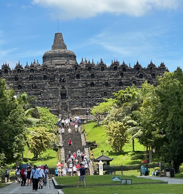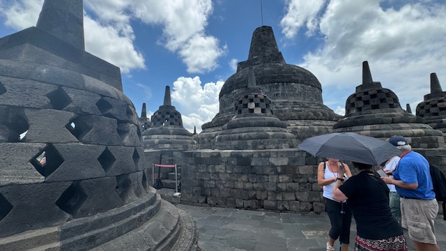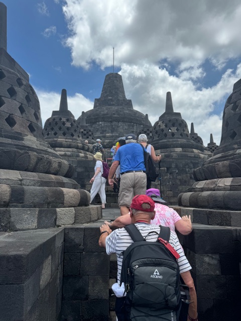 We took a Viking optional excursion to visit the Borobudur Temple, the largest Buddhist monument in the world and a UNESCO World Heritage Site. The temple is located approximately 70 miles from the port, but because of the narrow winding roads and local traffic it is a two-to-three-hour drive. So, the tour departed the ship at 7:30 AM giving us plenty of time to get to the temple. After transitioning from the industrial activities of the harbor area we drove along the out skirts of Semarang and into the Java countryside. We observed rice paddies, plush forests, coffee plantations, large stands of rubber trees and numerous small villages. At the halfway point we made a stop for coffee before heading on to the temple.