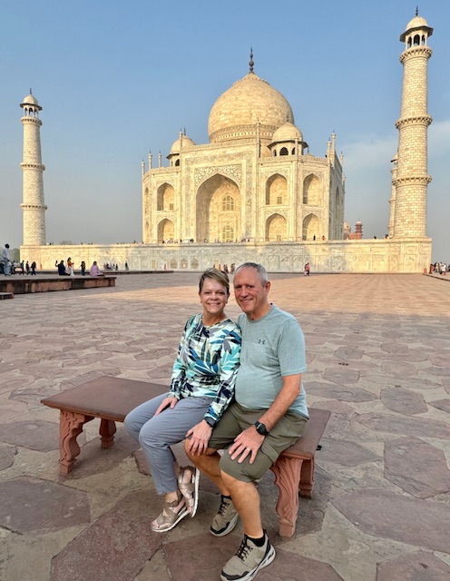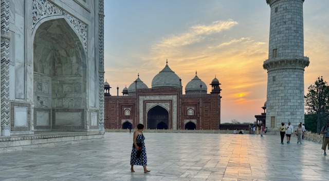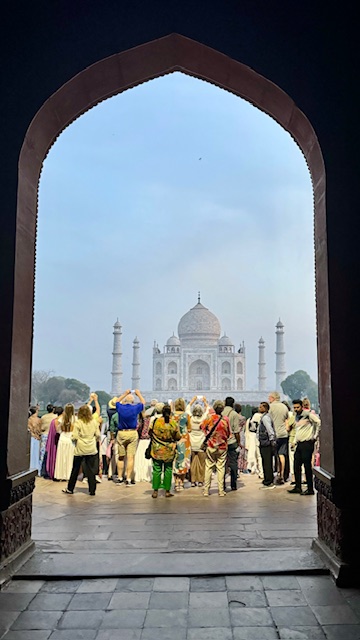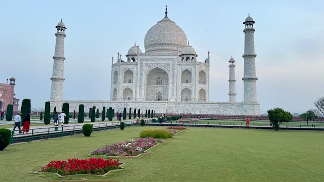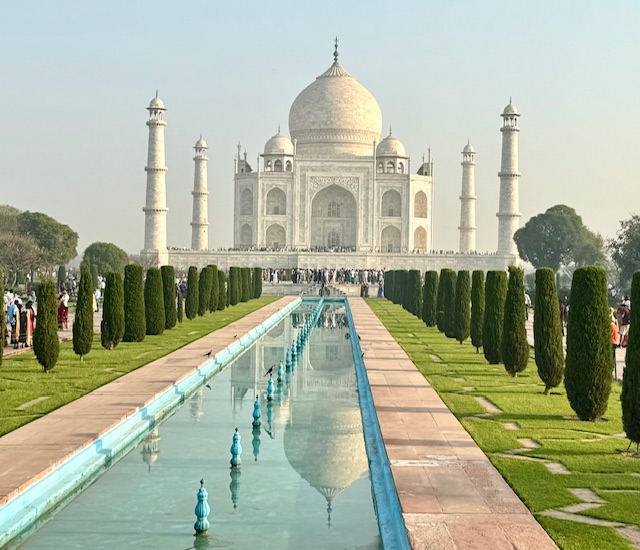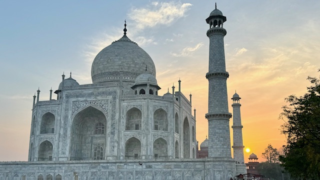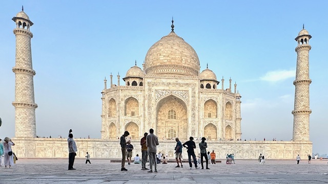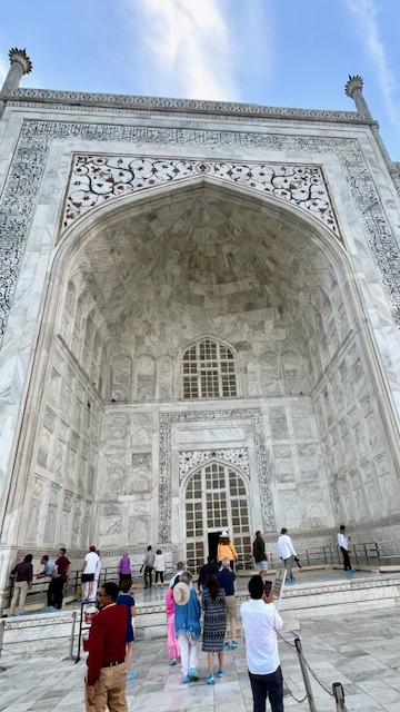This morning, we departed the hotel at 5:30 AM to view sunrise on the grounds of the Taj Mahal. This breath-taking structure and surrounding gardens were built by Mughal emperor Shah Jahan in the mid 1600’s in tribute to his wife empress Mumtaz Mahal ‘the Lady of the Taj’, who died in 1631, as a testament to his eternal love for her. The emperor sought designs from all over the world for the empress’s memorial and final resting place, the design of Turkish, Ustan Isa Afandi was selected. The main building material was a top-quality marble cut from a Quarry nearly 200 miles from the building site. Elephants were used to transport the heavy marble blocks and panels to the building site.