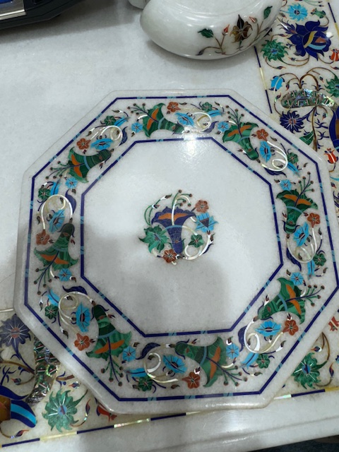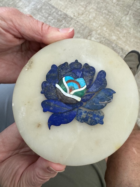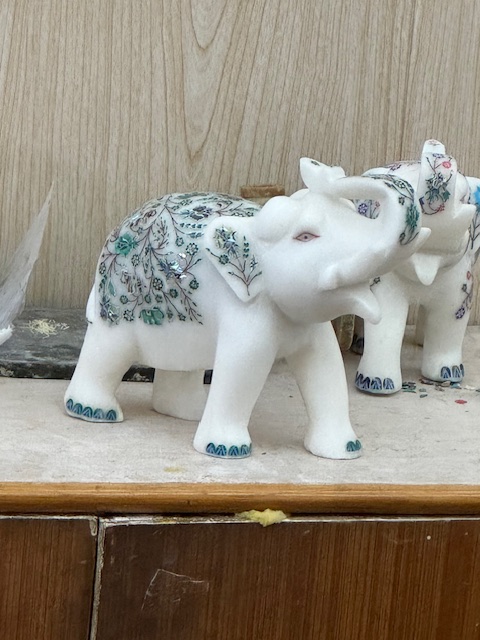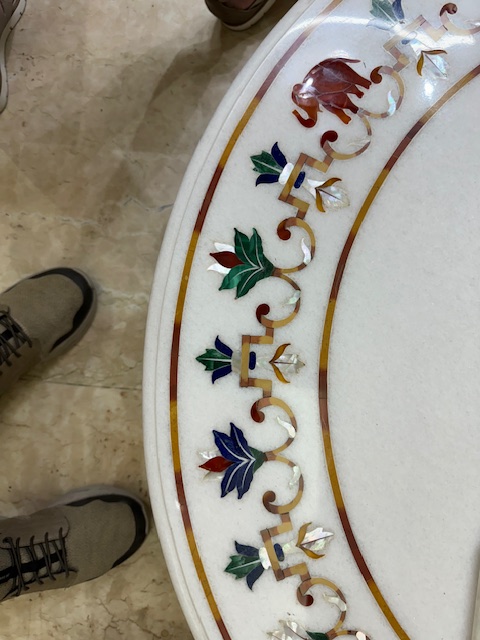 After watching the spectacular sunrise over the Taj Mahal, we returned to our hotel for breakfast after which we, once again, loaded out tour van for the five-hour Journey to the “Pink City” of Jaipur, but we had one more stop in Agra at the Kalakriti Marble Inlay Studio. This is a Handicraft studio that makes inlaid marble handicrafts using the same tools and techniques that were used to produce the inlaid marble panels at the Taj Mahal. Watching these incredible craftsmen at work making these beautiful works of art was amazing. Each piece is handmade and unique.