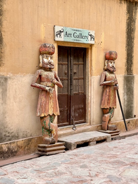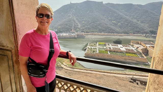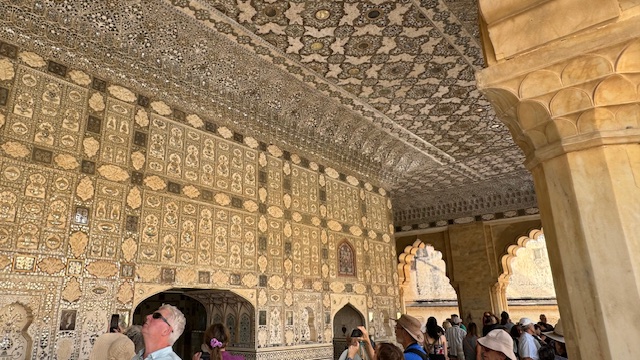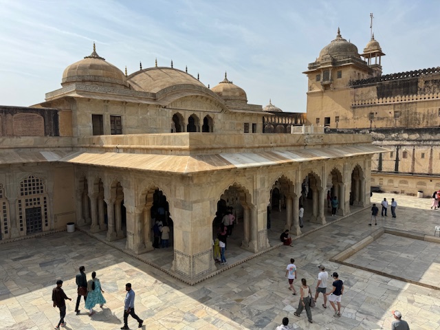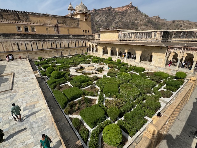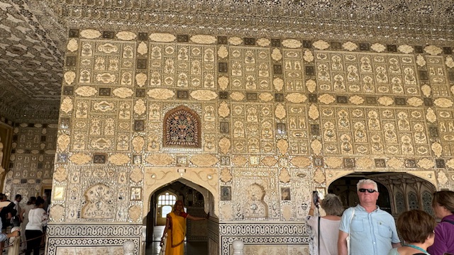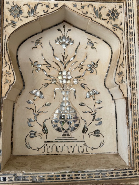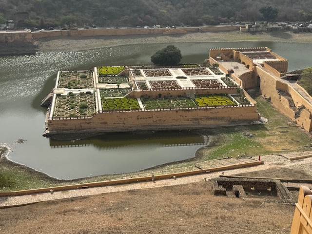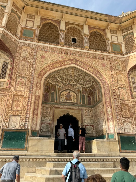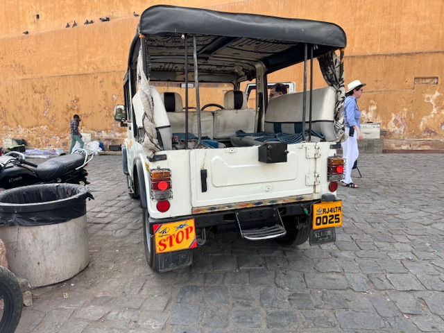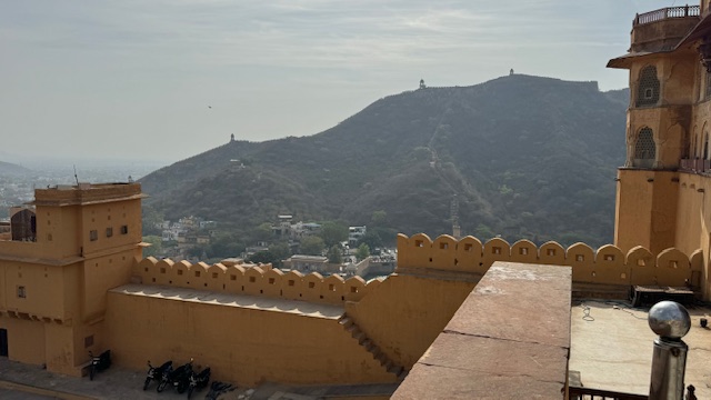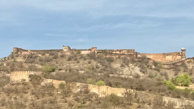 We continued through the city and into the hills overlooking the city to visit the Nahargarh Fort, built in 1734 by the Hindu Rajput ruler Maharaja Swai Jai Singh II. He also was the founder of Jaipur and chose to build the fort in the Aravalli Hills to use as a retreat place and home for his 9 wives. Adjacent to the fort is the magnificent Amber Fort. The Fort is surrounded by fortified battlements and overlooks the Maotha Lake. We took our tour van to the base of the hill that Amber Fort is on and from there road in jeeps to the fort entrance.
