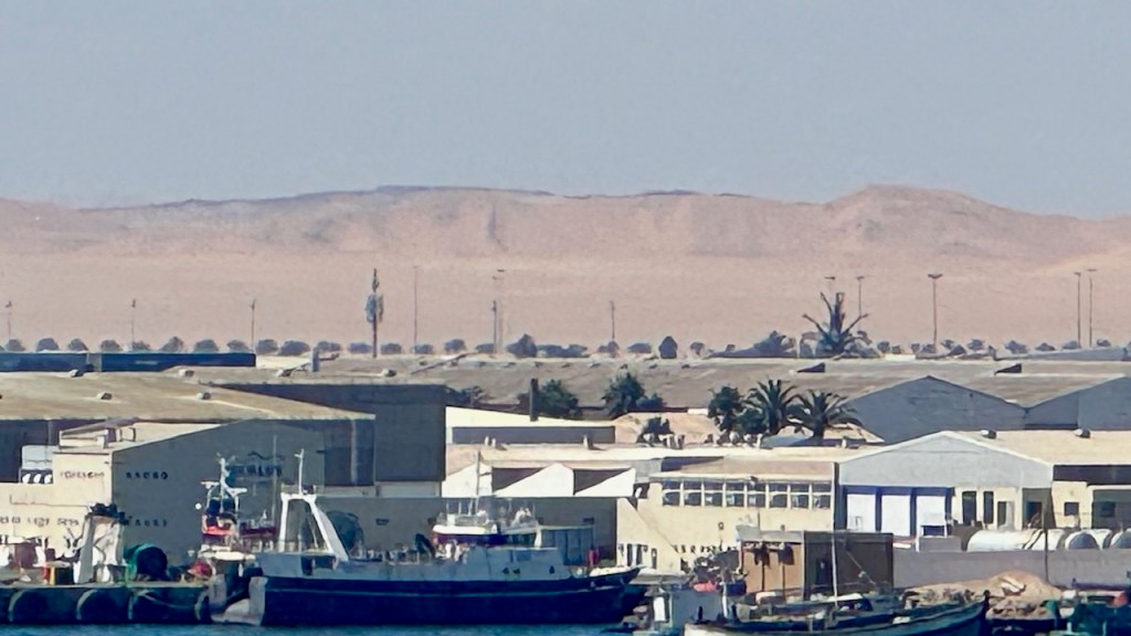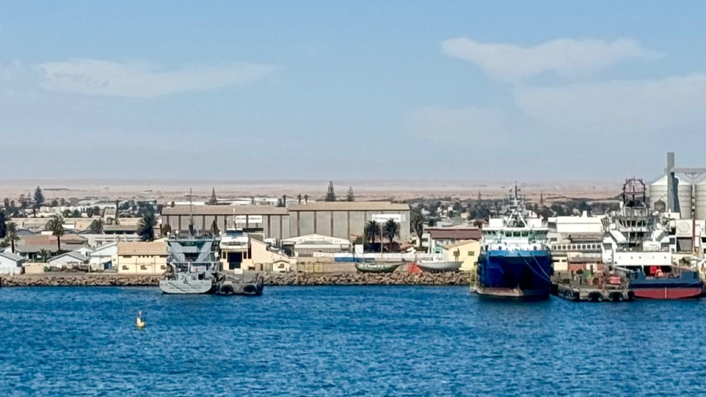 Today we were in Walvis Bay, Namibia. The city is named for the whales that lured fishing vessels to its plankton-rich waters. Walvis Bay or “Whale Bay” in English, enjoys a deep harbor and the protection of the Pelican Point sand spit. The Port was long valued by explorers making their way around the Cape of good Hope, but it was the British who occupied it by the late 1800’s and eventually incorporated it into their Cape Colony. Today, Walvis Bay is the gateway to the rich culture of Swakopmund, where German architecture recalls the settlers supported by the Kaiser. Natural beauty can be admired here where the Namib Desert meets the coast with its golden dunes spilling over to the ocean shores.