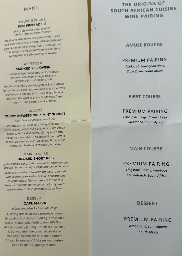 The weather was cool and foggy, so we decided to stay on the ship with friends and have a quiet dinner at the Chef’s Table. We have Guest Chef Jean Bentio Estazar on board for the next week with a special menu we wanted to try. The Chef’s Table is a specialty restaurant that features fixed themed menus with wine pairings that change every five days and generally have a regional theme. The menu that started tonight was called South Africa: Cuisine from the Rainbow Nation. It was a five-course dinner of South African dishes paired with South African wines. Here’s the Menu: