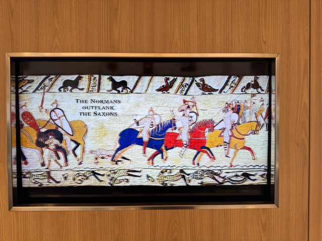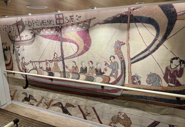 All of the ship’s stairwell landings, contain a reproduction of panels from the Bayeux Tapestry which dates back to the 11th century. The tapestry documents William the Conqueror’s invasion of England and the death of Anglo-Saxon King Harold in the Battle of Hastings. This is significant to Viking’s Heritage as Viking leader and kings played pivotal roles. King Harold was a son of Earl Godwin of Wessex, appointed by Knut the Great, son of Svein Forkbeard and grandson of Harald Bluetooth– both Vikings. William the Conqueror, who led the invading army, was a descendant of the Viking chieftain Rollo. William shook England’s shoreline when he arrived with a fleet of 600 ships, many of which were built in the traditional Viking clinker style. The tapestry depicts scenes leading up to and during the battle. Following the battle the areas once dominated by the Vikings evolved into separate nations/kingdoms thus ending the Viking era. The original tapestry is approximately 20 inches tall and over 200 feet long and resides in a museum in Bayeux, Normandy, France.