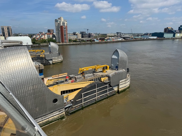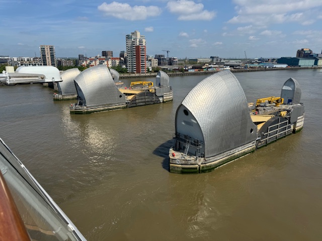 These are photos of the Thames Barrier a retractable barrier system built to protect the floodplain of most of Greater London from exceptionally high tides and storm surges moving up the river from the North Sea.
